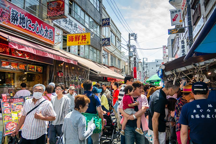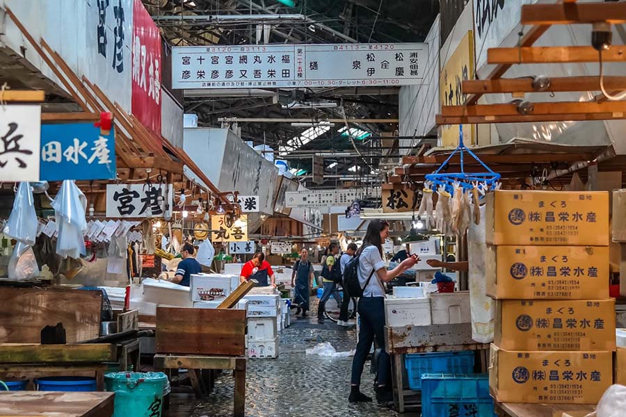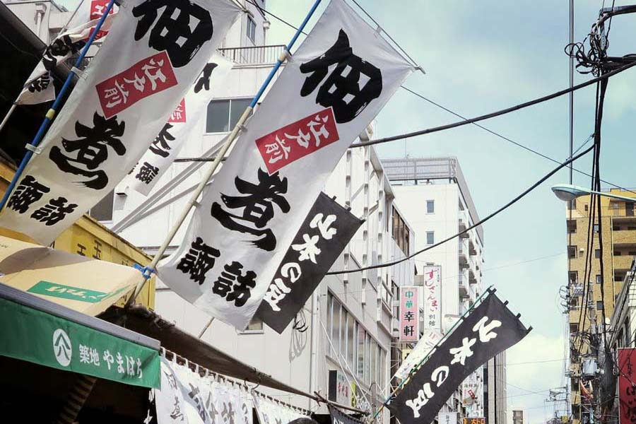 The deconstructed letterforms depict the cluttered environment and poor visibility of the Tsukiji Fish Market.